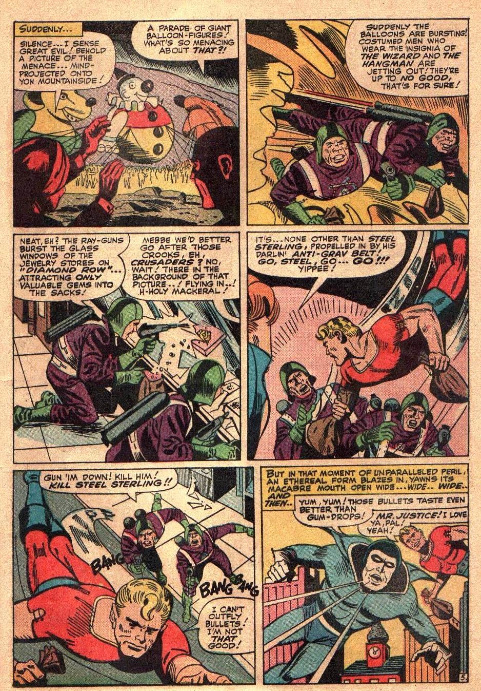 Mr. Justice arriving just in time. However, why Sterling says he can’t outrace bullets is puzzling since bullets had never been able to pierce his tough skin.