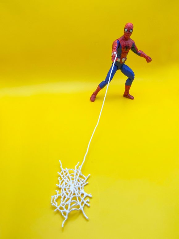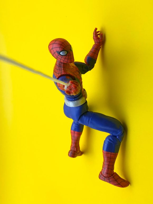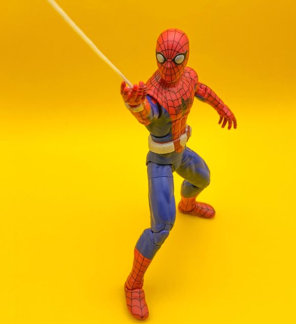 Spidey comes with an extra pair of open hands, good for relaxed and climbing poses, and for webshooting, since Hammond didn’t really do the “thwip” hand gesture. There are also two small web effects for placing over foes (I hope you have some plainclothes action figures, because there were NO super villains on the series). But more fun than those is the simple piece of rope that comes included. The webbing on the series was very obviously off-the rack rope, and this is a charming addition to recreate those scenes. Plus, you can pop the right hand off, slip off the Webshooter, and put the rope underneath it, and reassemble it to achieve some nice webspinning poses!