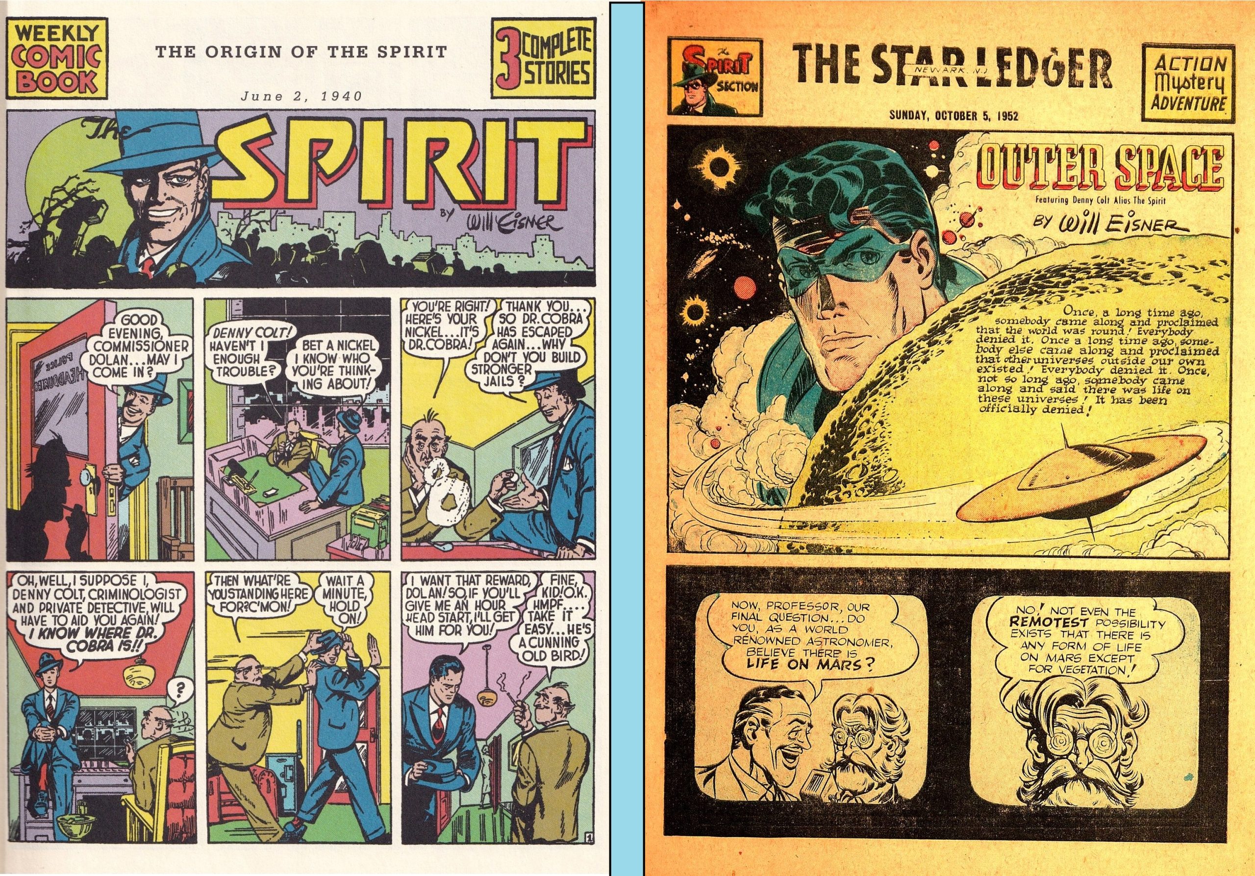 The Spirit’s first newspaper comic book section, June 2, 1940, written and drawn by Will Eisner, and the last, October 5, 1952, written by Jules Feiffer and drawn by Eisner (pencils) and possibly Al Wenzel (inks).