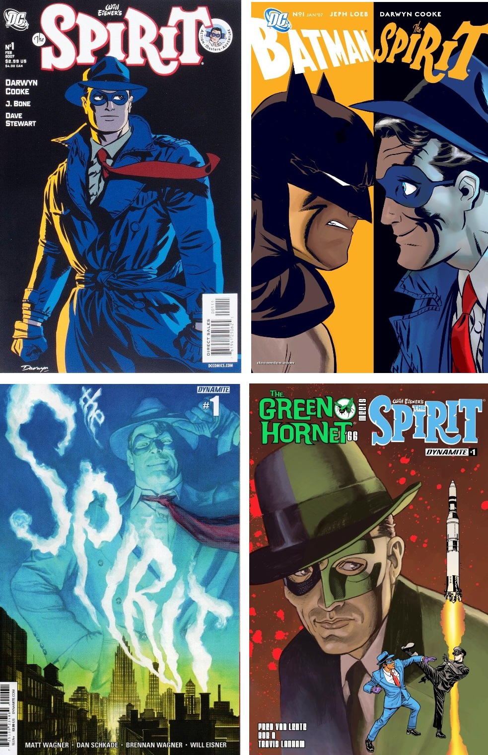 Top row (left to right): The Spirit #1 (Feb. 2007, DC), cover by Darwyn Cooke; Batman/The Spirit #1 (Jan. 2007, DC), cover by Cooke. Bottom row (left to right): The Spirit #1 (2015, Dynamite), variant cover by Alex Ross; The Green Hornet ’66 Meets The Spirit #1 (2017, Dynamite), variant cover by Ty Templeton. Cooke’s series will get an Artist’s Edition from Act 4.