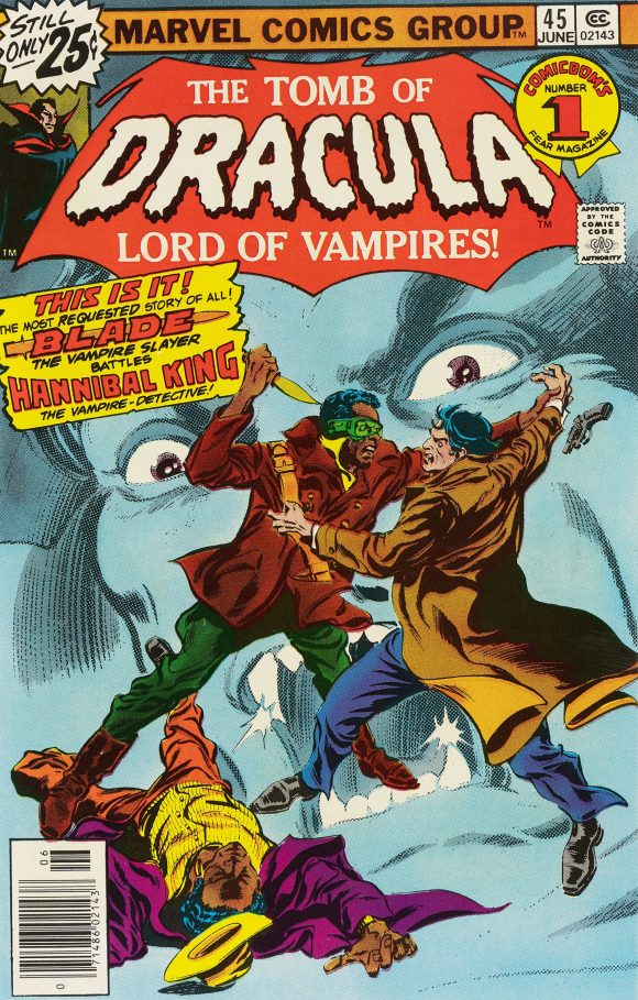1. Tomb of Dracula #45, Marvel. You could make reasonable cases for putting Superman #300 or Marvel Spotlight #28 in the top slot, but in the end, I’m going with the dramatic artistry of Gene Colan and Tom Palmer. Colan steals a page from Neal Adams’ book with the spectral, monochromatic Dracula looming behind the more traditionally printed Blade vs. Hannibal King battle, but he pulls off the visual trick almost as well. The eyes have it.