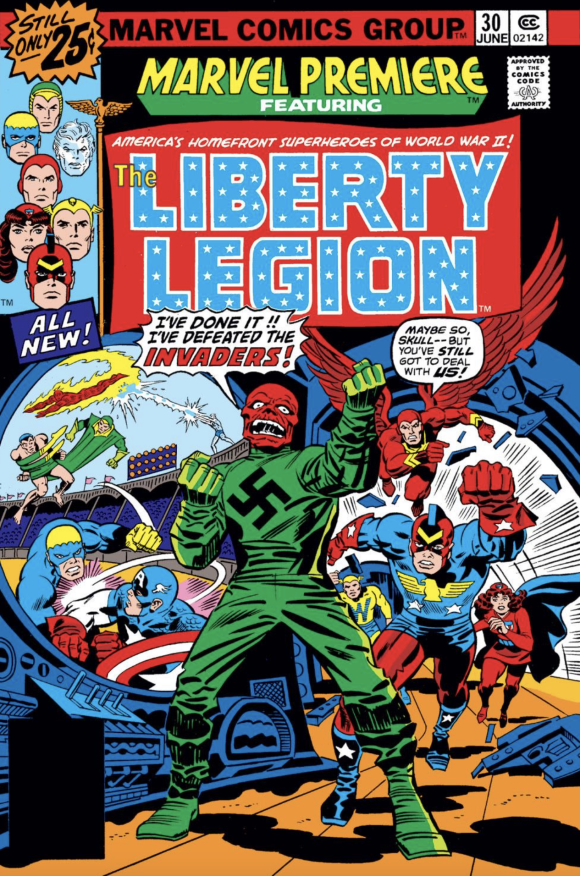 6. Marvel Premiere #30, Marvel. Brilliantly constructed, with the binocular-like portals framing the Invaders on screen and the recently minted Liberty Legion coming through the tunnel, while the Red Skull stands in a classic villain pose. The bright Liberty Legion logo stands out and adds an extra layer of pizzazz. There’s a lot going on here, but it really works.