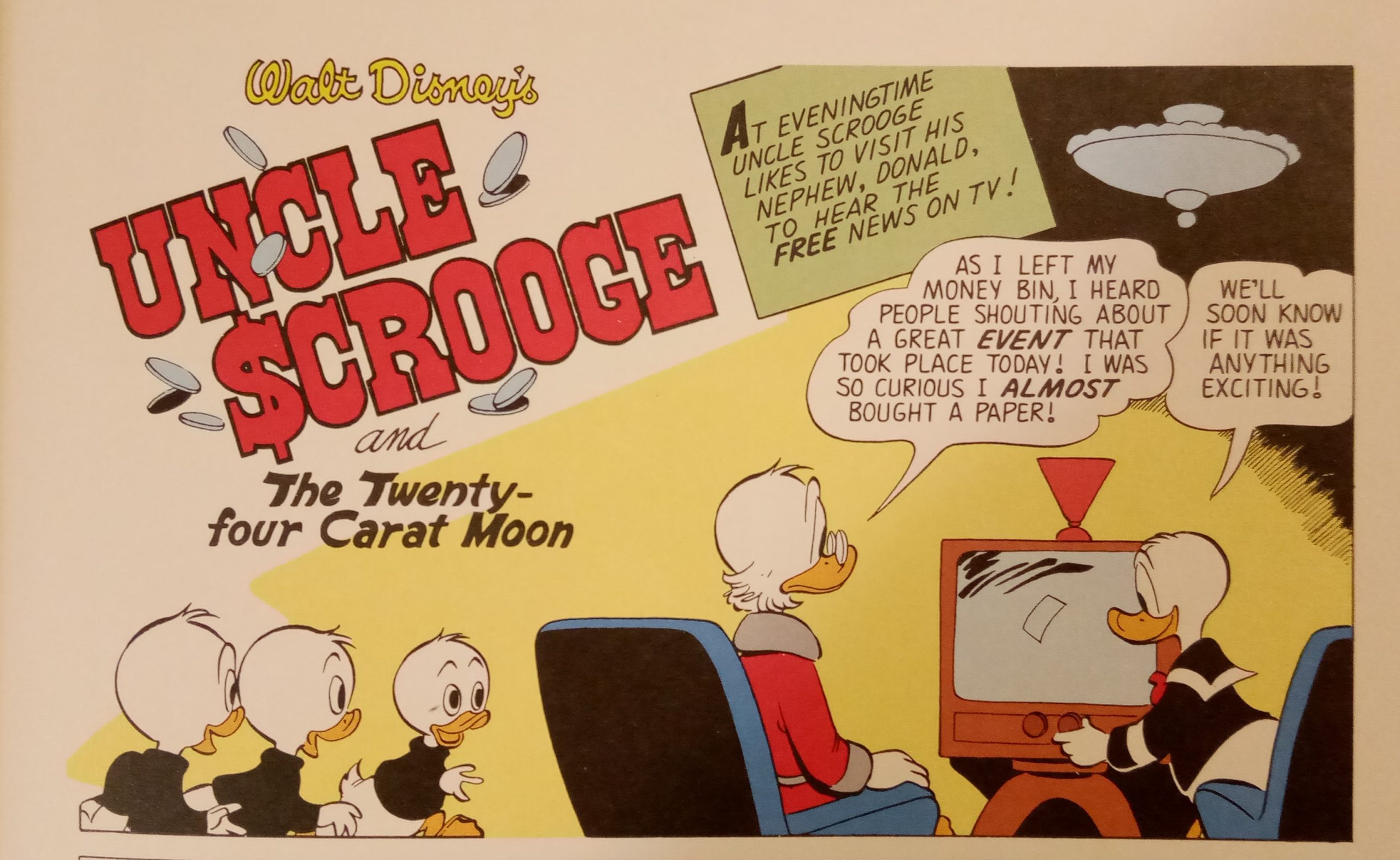 No surprise there, either, that Carl Barks — born 125 years ago, on March 27, 1901 — would find a way to combine the two for a new tale for Walt Disney’s Uncle Scrooge #24, published in October 1958: “The Twenty-four Carat Moon.”