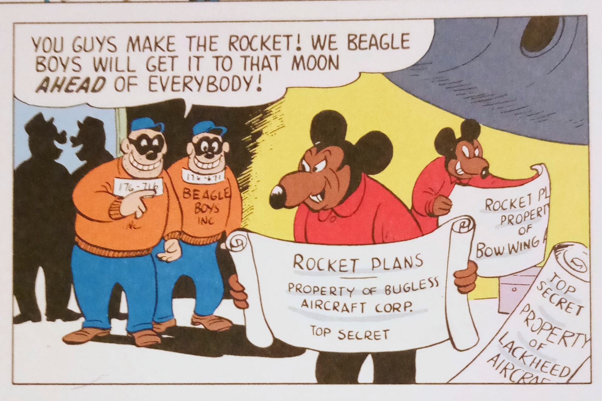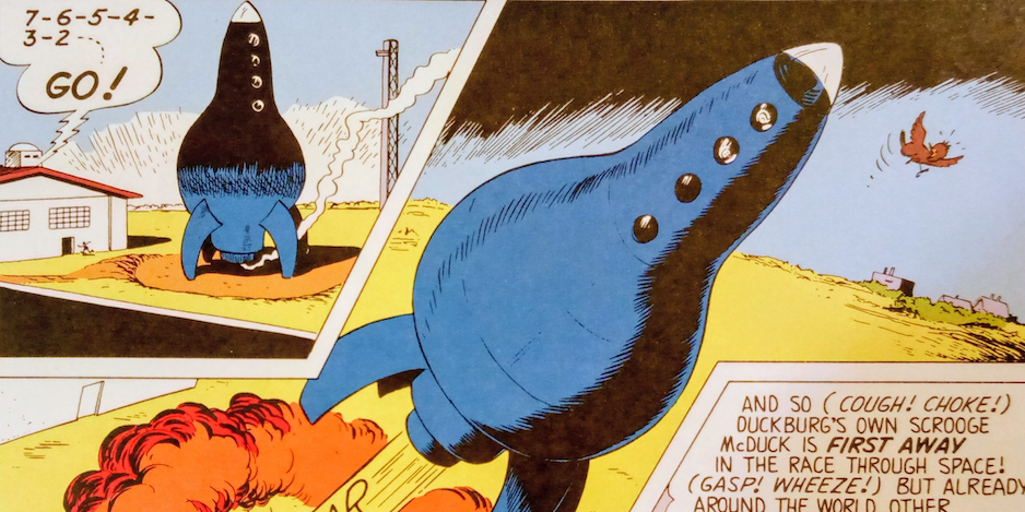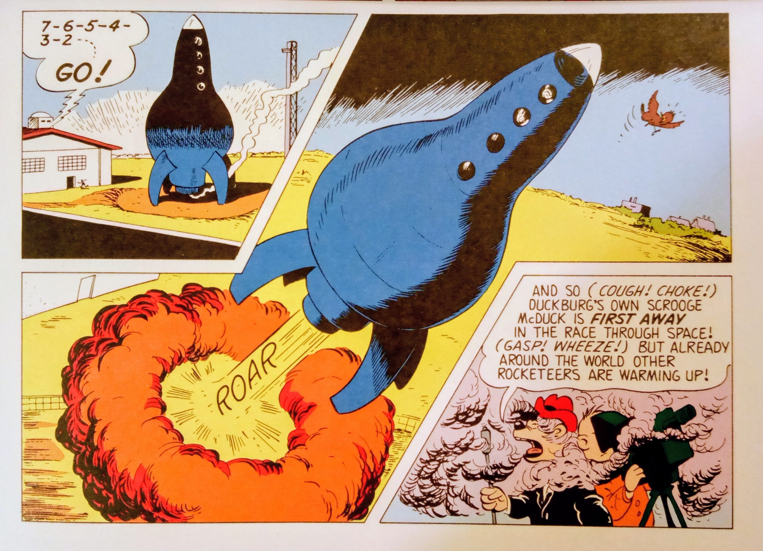 No surprise there. The Space Race was heating up and firing imaginations across the globe… including a certain ducky delineator from Oregon, who was writing and drawing funny Disney duck stories for Dell comic books.