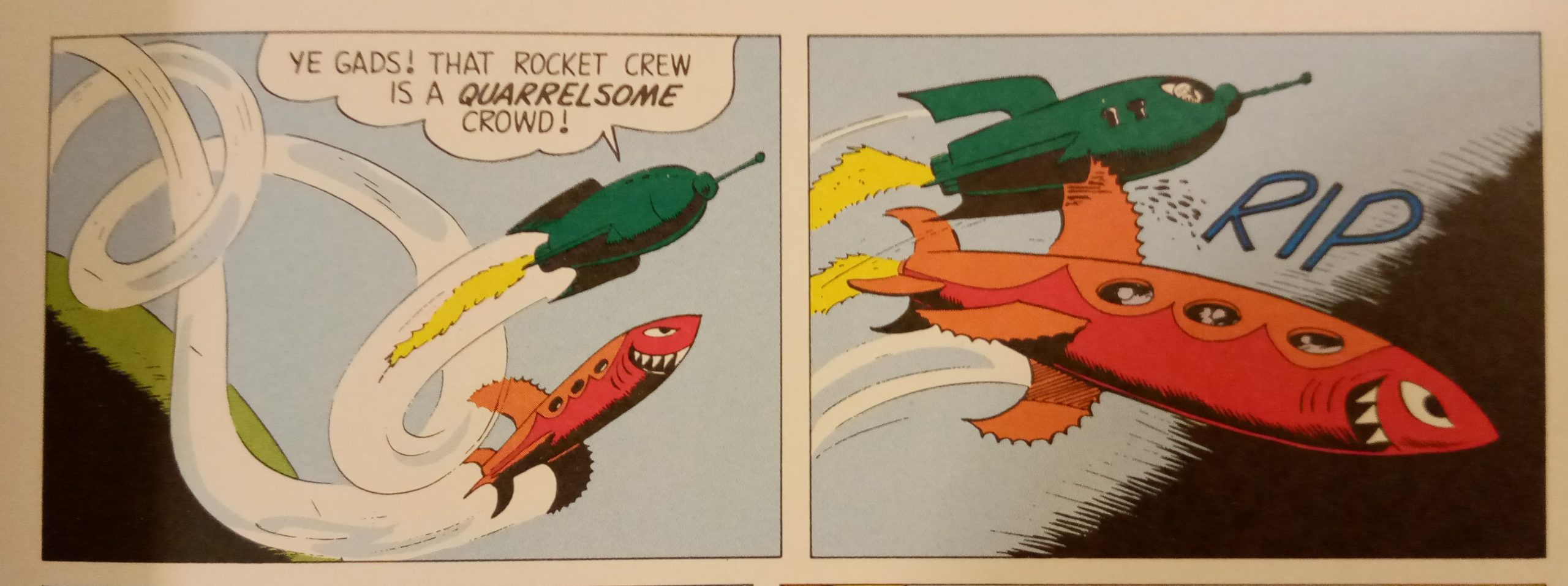 “The Twenty-four Carat Moon” is filled with great characters, great scenes, and all the great stuff Barks is known for. As a kid, I loved the designs of the rockets, as 1950s cartoony as they were. Each ship reflects its owner, from Scrooge’s bottom-heavy craft—perfect for stuffing moolah into—to a cattle king’s steer-like ship, complete with saddle and horns. The best of the bunch, though, is the rocket-of-choice for the devilish Beagle Boys, resembling nothing less than a razor-toothed shark. Back in the day, it reminded me of a similar ship from a big hardcover collection of Buck Rogers comic strips I had, the sharky ride of Killer Kane, villain without peer.