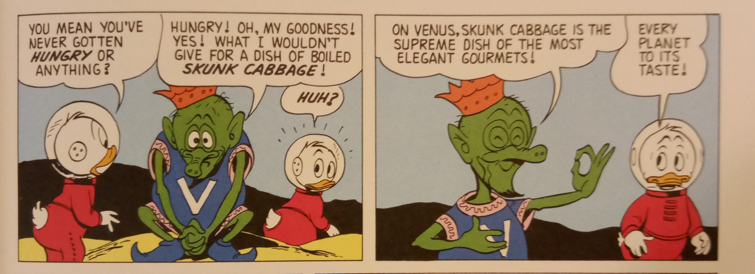 Oh, yeah. Muchkale the Venusian. We should definitely talk about him. Absolutely one of Carl Bark’s creepiest-goofiest aliens ever. As a kid, I was somewhat revolted by his appearance (green like a lizard, but he has little hairs sticking out?), but amused by his lust for skunk cabbage (did I even know what “skunk cabbage” was back then?). I’m not one-hundred percent certain what Barks intended with the Venusian’s moniker, but kale is, yeah, a kind of cabbage, so there is that. I guess that’s pretty funny, if I think about it.