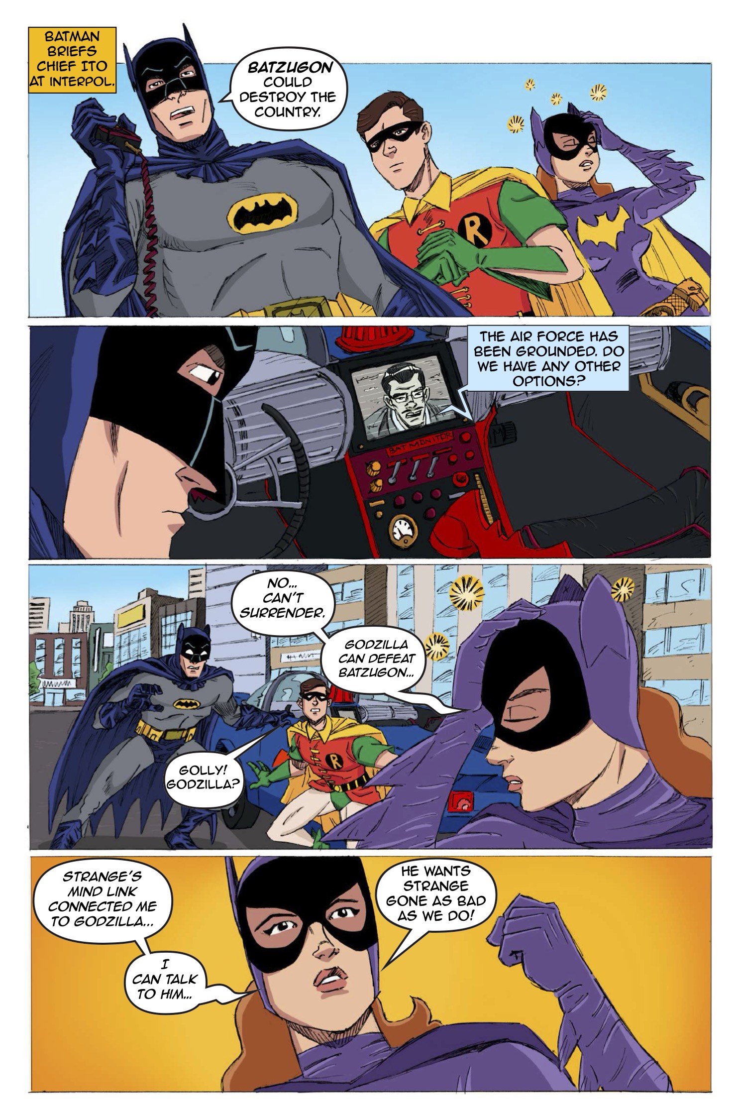 A quick recap: Batman ’66 Meets Godzilla, based on an actual 1960s film treatment, launched online for free in 2020, written by Eric Elliott and illustrated by a cast of thousands. Two issues were produced, essentially completing the story as outlined in the treatment. But work began on a third issue in 2022 and then… stopped.