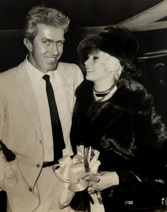 March 1965 news photo of Anita Ekberg and Rik Van Nutter at London Airport, captioned, “Anita flew in from Rome for a holiday with Rick, who has been filming in the latest James Bond film, ‘Thunderball’.”