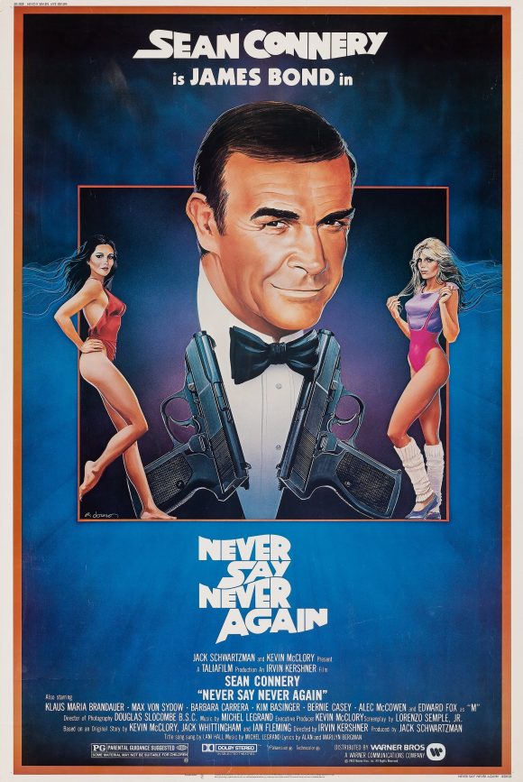 Of course, Kevin McClory did get to finally make his version of the Thunderball novel: Never Say Never Again (1983), which got the bonus of having Sean Connery starring. As most know, the title came from Connery saying “never again” about playing Bond after Diamonds Are Forever. However, the money was too good to pass up. (It is estimated he received, with salary and his percentage of the gross combined, $86.5 million.) Ricou Browning, who had been the underwater filming director of Thunderball, also directed the underwater action for the new film.
