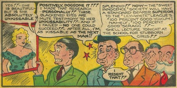 This makes the Lily-White League so successful that when elderly philanthropists die, they leave all their money to the league! This upsets “The Sweet Innocence Society.” The Society suddenly goes on a quest to find a “100 percent Perfect Good Girl” to compete with the League’s “100 Percent Good Yokum”.