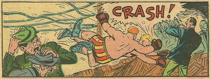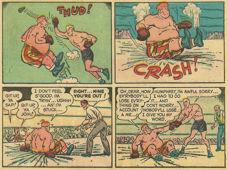 Joe is a boxer. The fact that he ends up in the ring is no biggie. Humphrey, however, is a gentle blacksmith who hates to hit people. The story begins with a quick explanation that Humphrey had recently beat a boxer named Balonki. Why this happened is unclear. It must have happened in a previous issue. I’m sure it was a wonderful story. The trouble this issue begins when two evvvvil boxing agents trick Humphrey into signing a fighting contract. (Side note: I really dig a lot of Ham Fisher’s art.)