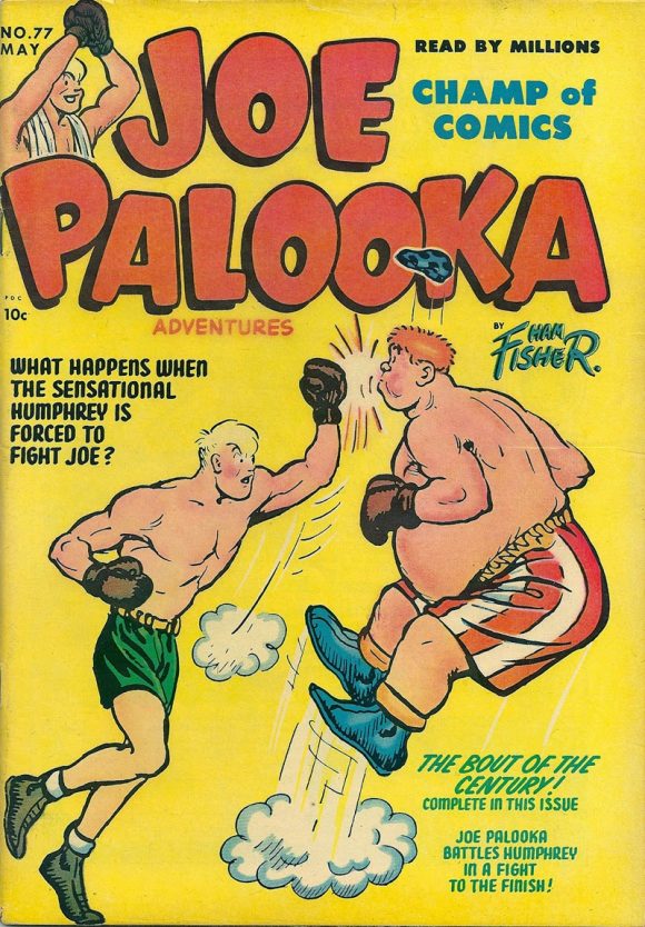 This week’s battle — JOE PALOOKA vs. HUMPHREY PENNYWORTH! First presented in 1953’s Joe Palooka Comics #77. Written and drawn by Ham Fisher, published by Harvey: