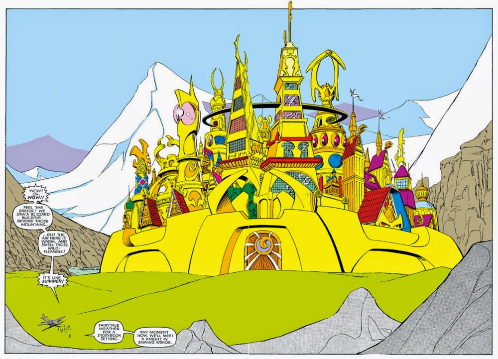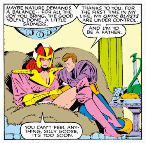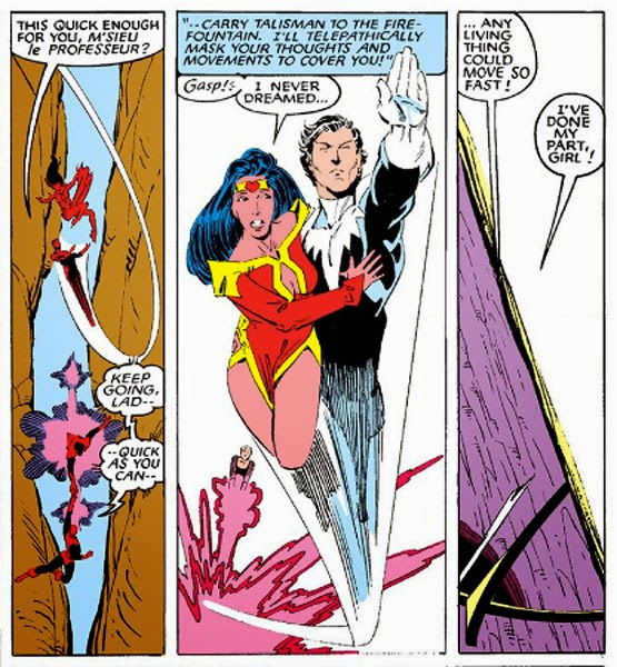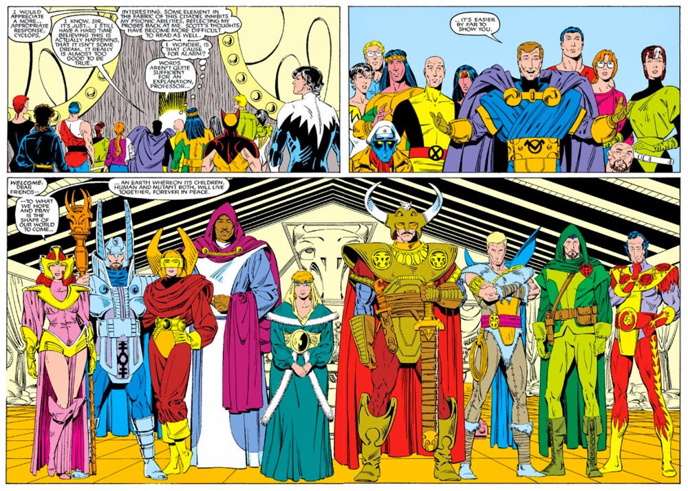 You may wonder why everyone is dressed so grandly. There is a “Firefountain” of magic that shoots up through a nearby mountain. This fountain can heal all pain while also giving everyone superpowers! With great power comes impractical costumes. Here’s Scott Summers (Cyclops) and Madelyne Pryor, who were on the downed plane and now live in this magical city.