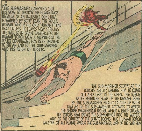 Namor, the Sub-Mariner, has vowed to destroy the human race. The Human Torch has recently joined the police department. As Namor attempts to wreck the George Washington Bridge, the Human Torch arrives to stop him. I think I’m going to have to side with the Torch on this one.