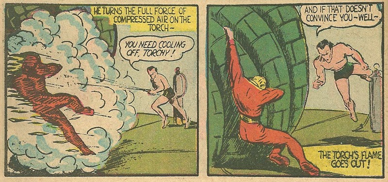 Namor soon retreats to his winged submarine to grab an air tank. He immediately returns to the surface and quickly blows out the Torch’s flame.