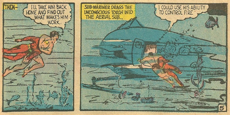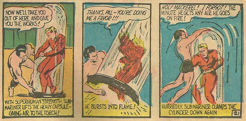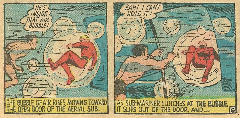But wait! Namor accidentally loses control of an air hose (which powers his engine) and it hits the Torch. Not only does it revive the Torch, it also surrounds him with an air bubble! And, like a fart in a bathtub, it starts to float to the surface. Namor tries to stop the bubble, but he can’t!