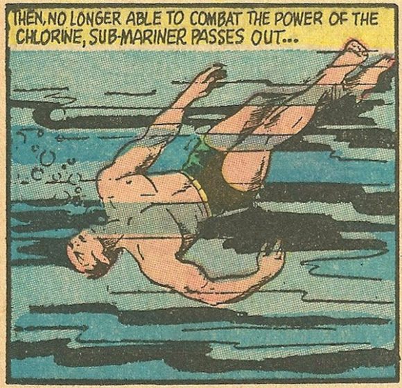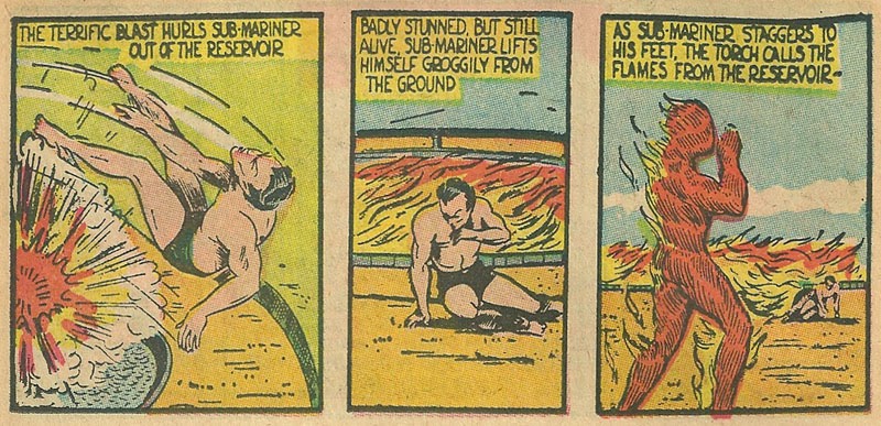 The bubble bursts as it reaches the surface. The Torch is free, on fire, and the battle continues on land. Soon, Namor has jumped into a water reservoir for a refreshing dip. The Torch (somehow) covers the reservoir with flame, trapping Namor. Namor immediately starts to suffocate because of the water’s chlorine content. He passes out.