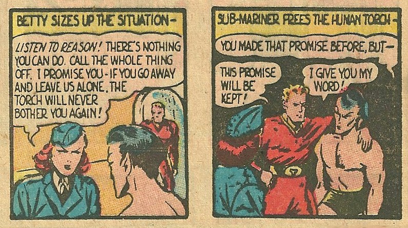 First up, the Human Torch vs. the Sub-Mariner! Originally presented in Marvel Mystery Comics #9, 1940. Story by Bill Everett, Carl Burgos and John Compton. Art by Bill Everett and Carl Burgos.
