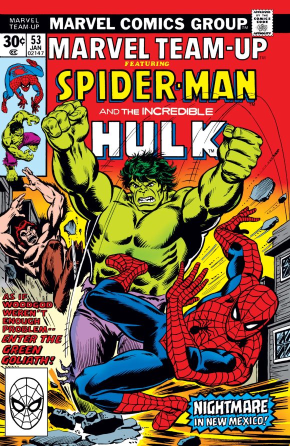 See, Bill had this interesting thing he did on the title: some Marvel gnashing of teeth between the superstars, a miss of the minds, a team-up that wasn’t really a team-up, per se. This is in clear evidence throughout the Iron Man tale of MTU #48-51 where May Parker’s nephew might rather beat Tony Stark’s face in than work with him. It made for a prickly, yet fascinating narrative. Marvel Team-Up #53 continued that theme with the Hulk roping both Woodgod and Spidey into his circle of rage, even remembering that “Bug Eyes” fought him in the past. It’s not until the next issue that a little “let’s try to work together” came across.