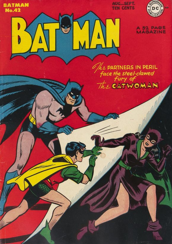 This week I decided to feature my cover to the second Simpsons Comics trade paperback, Simpsons Comics Spectacular, which is an homage to two Golden Age Batman covers. Batman #42 is the first Golden Age Batman comic I ever bought, and I was inspired by the gimmick of the Dynamic Duo pulling back the cover to reveal a clawing Catwoman. This issue itself was a swipe of the cover to Batman #14 from five years earlier, featuring the Penguin.