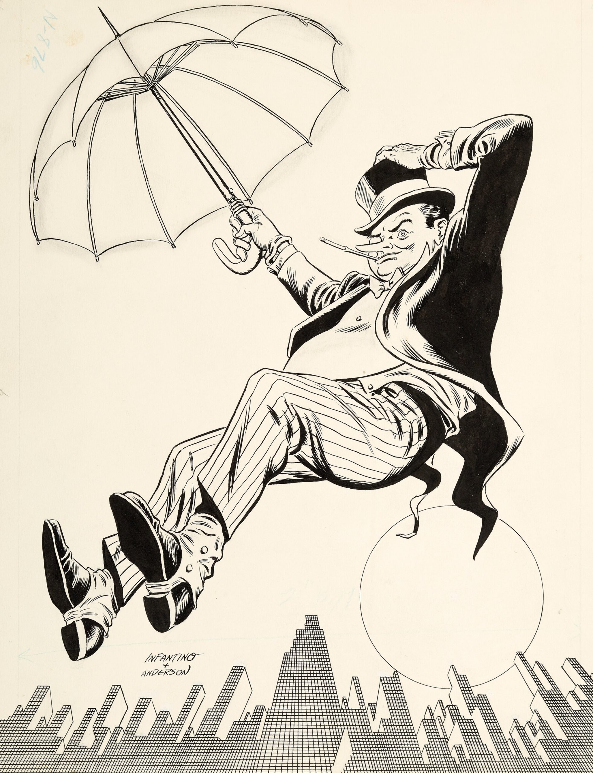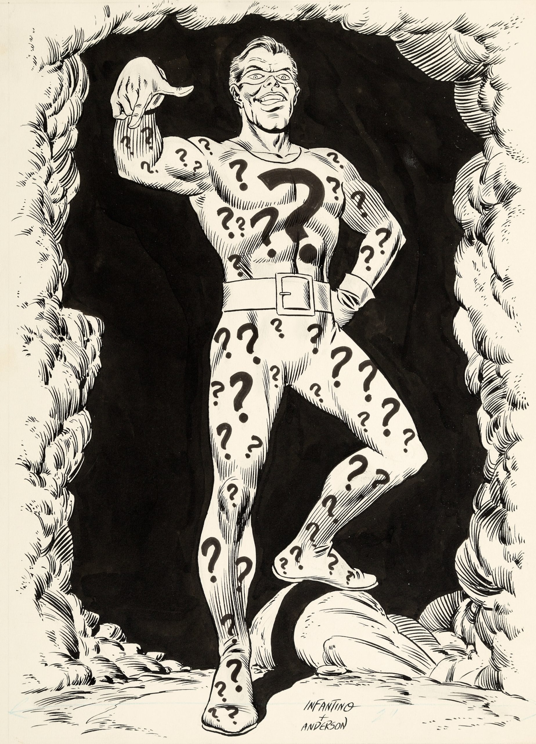 One of the fun things about looking at the original art is how much detail Carmine and/or Murphy put into these posters: The Penguin is sporting cuff links — plus, his umbrella ribs are capped! And man, did they go to town on the Riddler’s question marks!