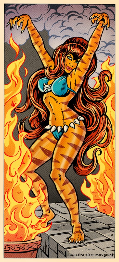 All the women had plain skin and wore animal print bikinis. I think it’s fun Tigra does the flip of that!