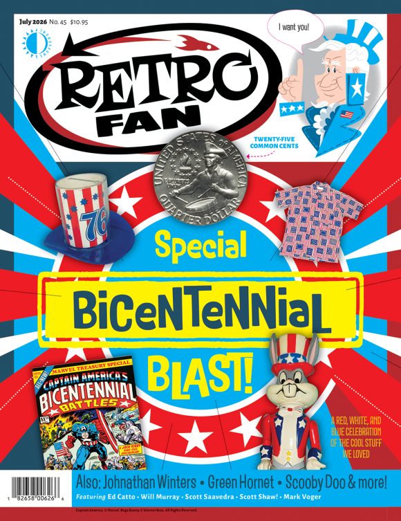 What’s blue, white, and read all over? It’s RetroFan #45’s spotlight on the 50th anniversary of America’s Bicentennial—and all its pop culture history, collectibles, comics, and even the 1776 Broadway Musical! Plus, you’ll be buzzing as Will Murray drives the Black Beauty behind that “Kissin’ Candy” billboard to reveal the secrets of The Green Hornet, while Scott Shaw! shines the spotlight on funnyman Jonathan Winters. Also: ReJECTED by Scott Saavedra, columns by regulars Mark Voger and Andy Mangels, and more! Edited by Ed Catto.